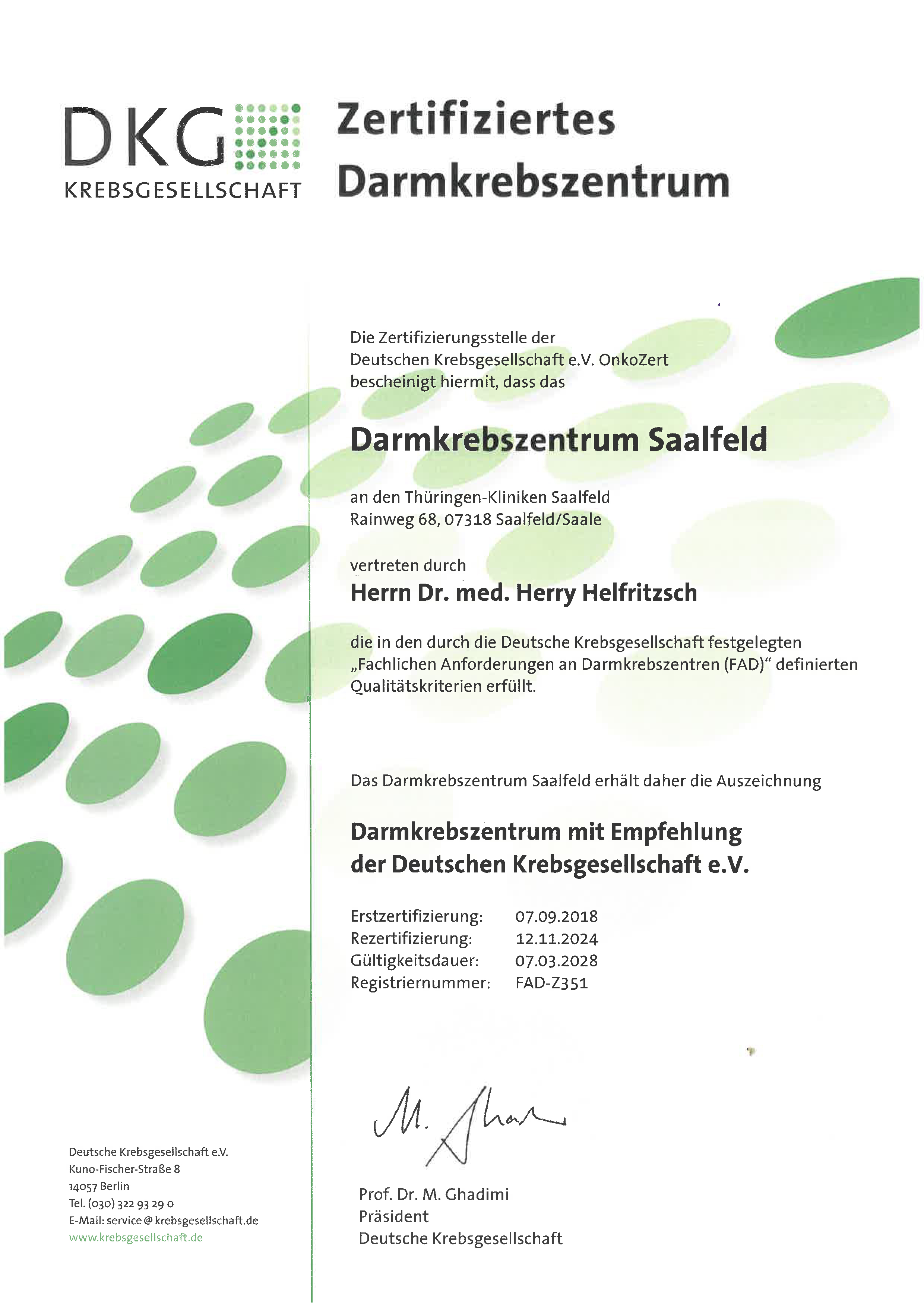 Das Darmkrebszentrum Saalfeld erhielt am 7. September 2018 die Auszeichnung "Darmkrebszentrum mit Empfehlung der Deutschen Krebsgesellschaft e.V.". Im Februar 2018 erhielt Chefarzt Dr. Helfritzsch die Qualifikationsurkunde "Senior-Darmoperateur" von der Deutschen Krebsgesellschaft.