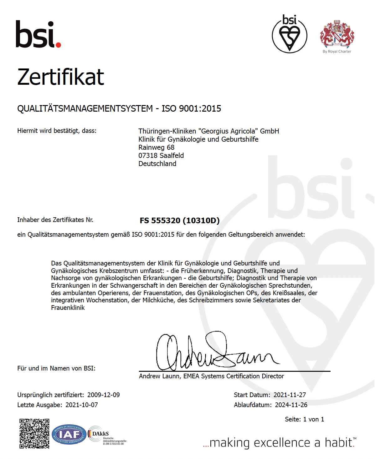 Der Chefarzt der Klinik ist zur vollen Weiterbildung im Fachgebiet Gynäkologie/Geburtshilfe sowie in den Schwerpunktgebieten gynäkologische Onkologie, spezielle Geburtshilfe und Perinatalmedizin berechtigt.