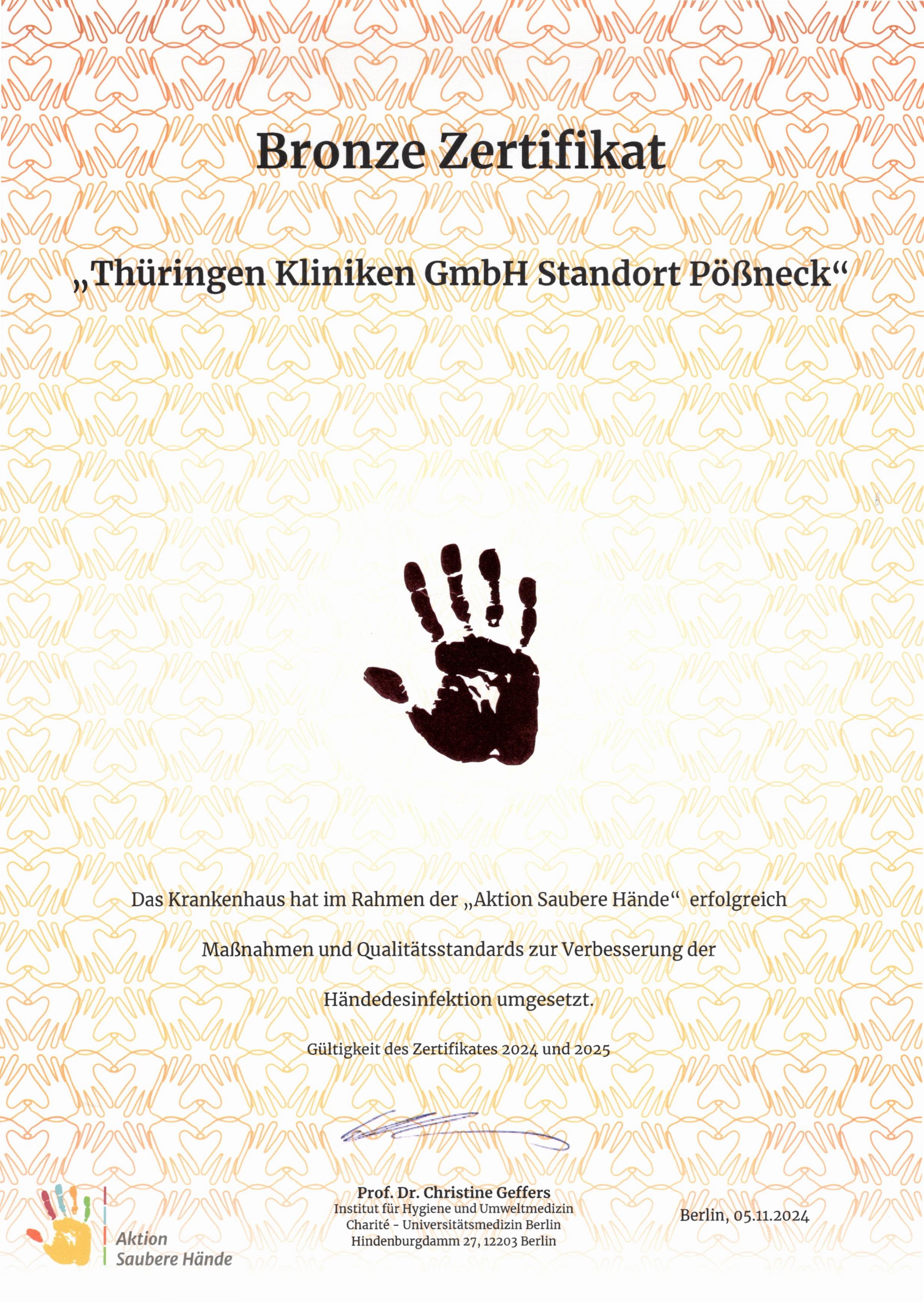 Die Thüringen-Kliniken sind eines von 1.200 Krankenhäusern, die bundesweit an der Aktion teilnehmen. Die Idee dazu kam von der Weltgesundheitsorganisation WHO, die sich zum Ziel gesetzt hat, weltweit die Zahl der Krankenhausinfektionen zu senken. Die Händedesinfektion ist die älteste und wirksamste Methode zum Schutz von Patienten und Personal vor Infektionen. Weitere Informationen sind der Webseite der Aktion „Saubere Hände" zu entnehmen.