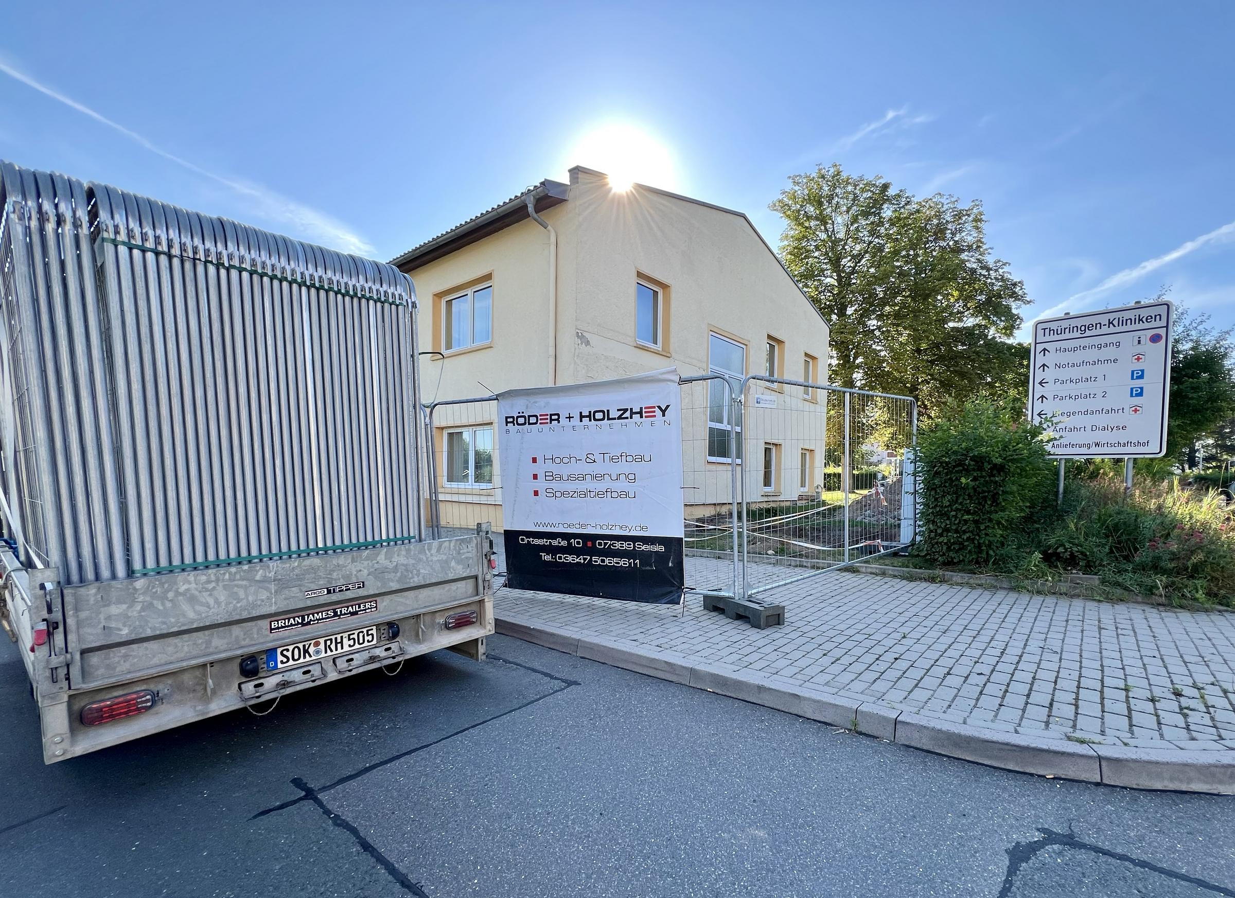 Mit dem Aufstellen des Bauzauns haben heute die Bauarbeiten für die neuen Rettungswache am Klinikstandort Pößneck begonnen.