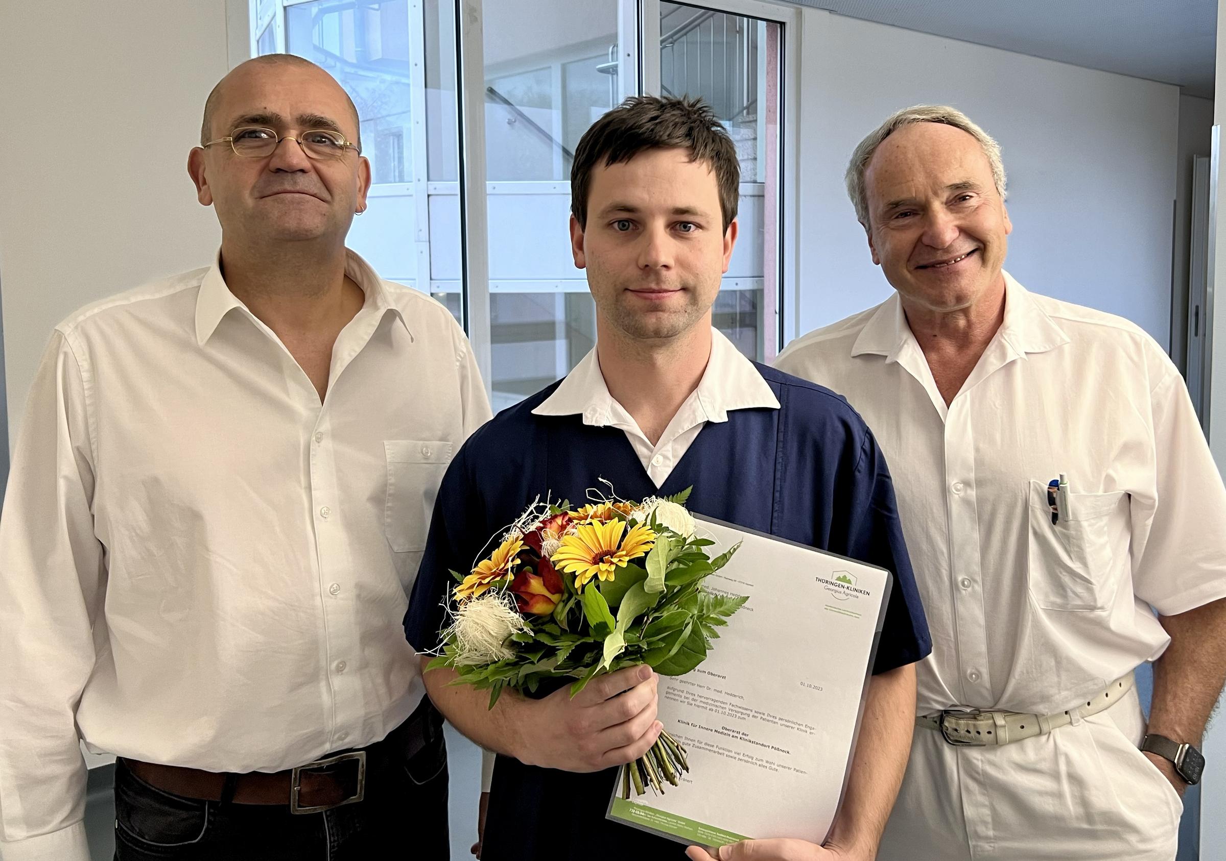 Zur Ernennung erhielt der neue Oberarzt Glückwünsche von seinem Chefarzt und von Geschäftsführer Dr. med. Thomas Krönert, die ihm zu diesem wichtigen Karriereschritt gratulierten.