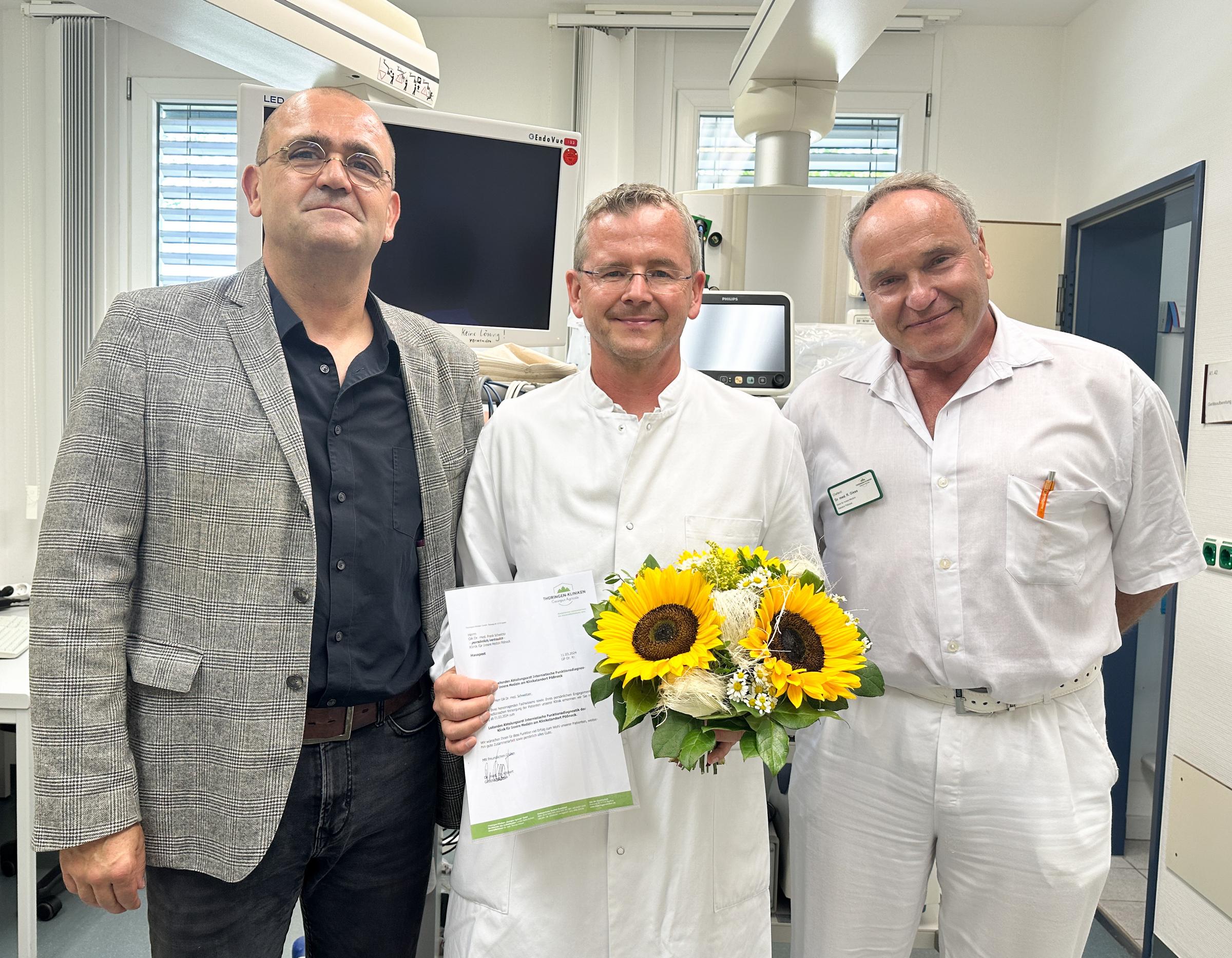 Chefarzt Dr. med. Ralph Giese hatte die Ernennung seines langjährigen Oberarztes vorgeschlagen. Dr. med. Frank Schweitzer gehört seit zwei Jahrzehnten zum Team der Klinik für Innere Medizin Pößneck. Hier beendete er seine Weiterbildung, die er im Juni 2011 als Facharzt für Innere Medizin/gesamte Innere Medizin abschloss. Außerdem engagiert sich Dr. med. Schweitzer im Antibiotika-Stewardship der Thüringen-Kliniken. Als hygienebeauftragter Arzt seiner Klinik setzt er Hygienestandards um und überwacht diese, um die Patientensicherheit zu gewährleisten.