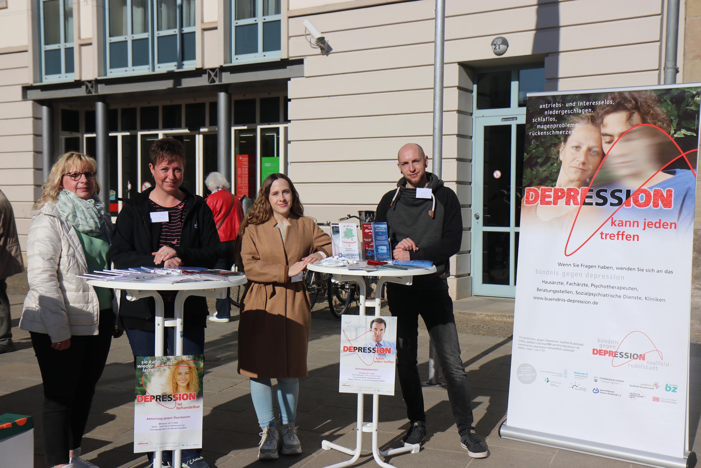 Als Vertreter des „Bündnisses gegen Depression Saalfeld-Rudolstadt“ gaben die Mitarbeiter vom Zentrum für seelische Gesundheit der Thüringen-Kliniken, Bianca Kasper und Mirjam Langmesser, sowie die Mitarbeiter des Landratsamtes Saalfeld-Rudolstadt, Gesundheitsmanagerin Anna Dawedeit und Alexander Klinger, Auskünfte und beantworteten Fragen. Das Angebot war altersunspezifisch ausgerichtet und wollte alle Bürgerinnen und Bürger ansprechen. Informiert wurde dabei auch über die Selbsthilfegruppen des Landkreises, das Bündnis gegen Depressionen sowie bestehende Hilfs- und Beratungsstellen im Landkreis, die für jeden offenstehen.