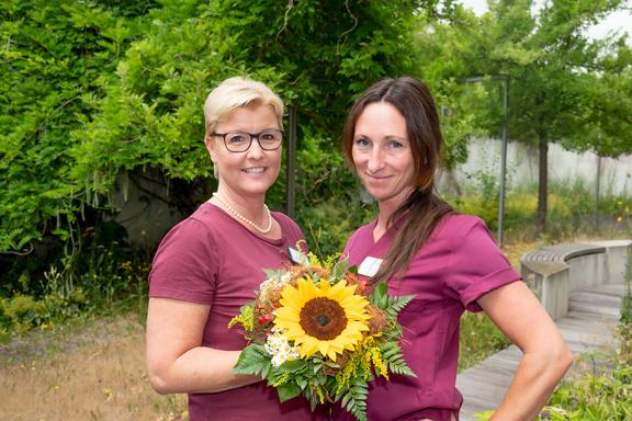 Ihre Chefin Suzanne Wurzbach gratulierte ihr mit einem Blumenstrauß zur neuen Aufgabe und freut sich auf die weitere Zusammenarbeit. Zugleich dankte sie Kristin Ensenbach für deren bisherige Arbeit als Stellvertreterin.