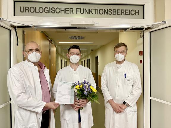 Auf Empfehlung von Chefarzt Dr. med. Kai Langer wurde Alexandru Cerlat zum Funktionsoberarzt der Klinik für Urologie ernannt. Er gehört seit Sommer 2014 zum Team der Klinik und legte vor zweieinhalb Jahren seine Facharztprüfung ab. Geschäftsführer Dr. med. Thomas Krönert würdigte die Arbeit des neuen Funktionsoberarztes in den zurückliegenden Jahren. Künftig will sich Funktionsoberarzt Alexandru Cerlat auch in die Einführung der digitalen Patientenakte in seiner Klinik einbringen.