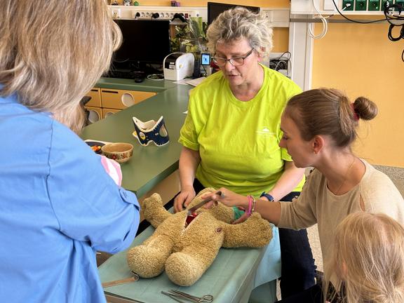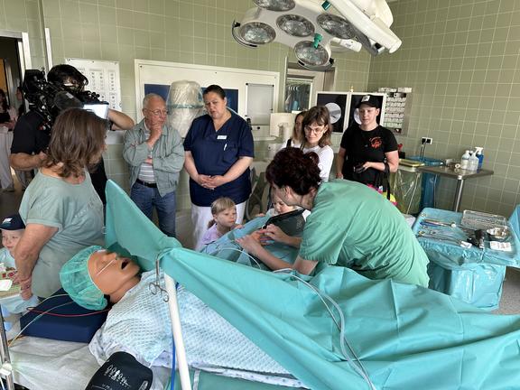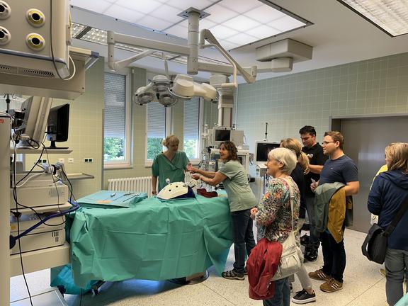 Ein besonderes Highlight waren die interaktiven Stationen, an denen Besucher praktische Erfahrungen sammeln konnten. So gab es beispielsweise einen Stand, an dem das richtige Desinfizieren der Hände geübt werden konnte. Ein besonderes Highlight war die Möglichkeit, am Pelvitrainer laparoskopische Operationen zu üben, was bei den Besuchern großes Interesse weckte und ihnen einen faszinierenden Einblick in diese minimal-invasive Technik ermöglichte. Die Besucher hatten die einzigartige Gelegenheit, eine Handoperation per Videomitschnitt zu verfolgen, was ihnen einen beeindruckenden Einblick in die chirurgischen Fähigkeiten und Techniken unserer Ärzte bot.
