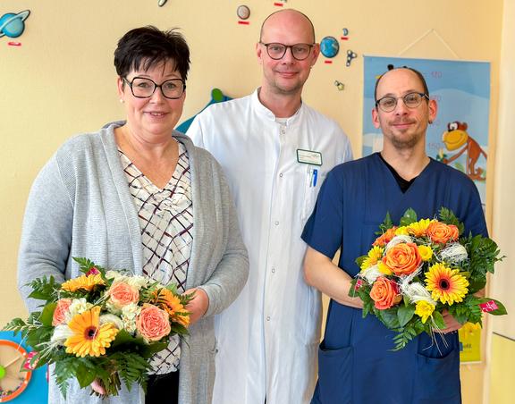 Zum Jahresbeginn 2024 hat Uriel Grund die kommissarische Pflegeleitung der Kinder- und Jugendmedizin übernommen. Er übernimmt die Position von Monique Müller, die auf eigenen Wunsch in die "zweite Reihe" zurückgetreten war. Chefarzt Dr. med. Robert Kästner bedankte sich für die gemeinsame Arbeit in den zurückliegenden Jahren und die vielen Projekte, die in dieser Zeit auf den Weg gebracht wurden. Gleichzeitig freut er sich auf die zukünftige Zusammenarbeit mit Pfleger Uriel Grund.