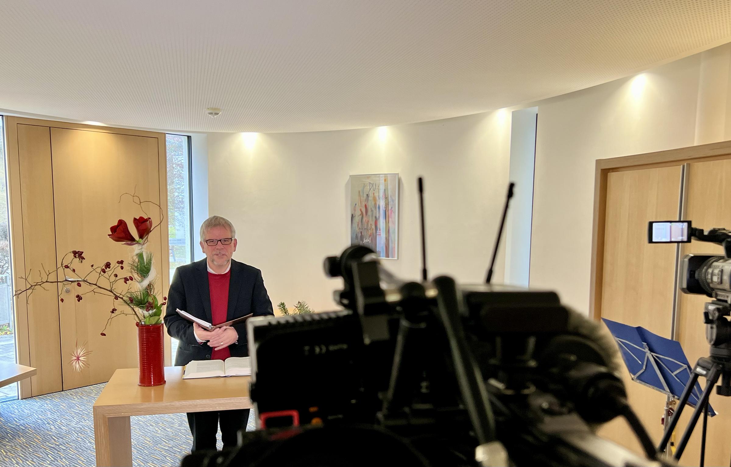 Pfarrer Christian Sparsbrod, Klinikseelsorger der Thüringen-Kliniken, spricht in seiner Andacht über die biblische Geschichte des Weihnachtsfestes, wie sie der Evangelist Lukas übermittelt.